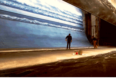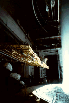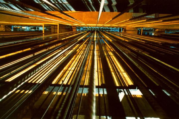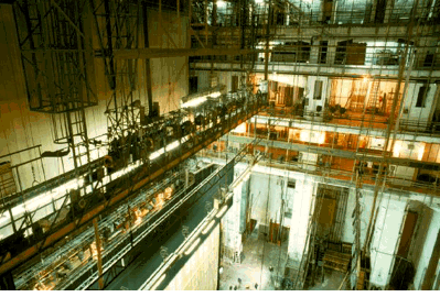 Глазам открывается огромный, убегающий в даль лес разнокалиберных труб, тускло поблескивающих в полумраке. Возникает ощущение, что попал внутрь огромного живого организма, который вот-вот вздохнет сотнями своих легких и заглотнет Тебя как пылинку. Мне, почему-то, всегда хотелось миновать этот участок как можно быстрее и спустится вниз. Внизу, т.е. на уровне самой сцены, стоят смотанные в огромные рулоны декорации к спектаклям. Интересно бродить среди них, вдыхать ни на что не похожий, запах оперного закулисья и угадывать для какого именно спектакля какой рулон предназначен: вот это золотой задник для "Сказок Гофмана", вот на сгибе виднеются зубцы башни, с которой бросилась Тоска, а вот сад сладострастной Наины из Глинковского "Руслана"... А вокруг деловито копошатся работники постановочного департамента, одетые в синюю униформу с надписями "OPERA" на спине и на груди -- устанавливают декорации к вечернему "Nabucco".